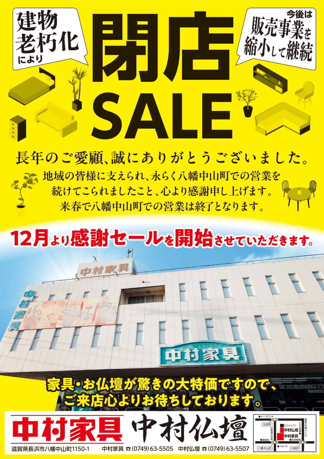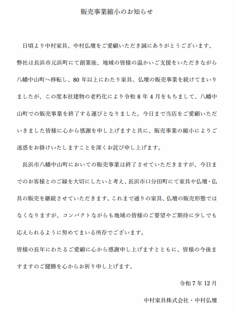 地域の皆様の温かいご支援をいただき、80年以上家具・仏壇の販売を続けてまいりましたが、本社建物の老朽化によりまして販売事業を縮小する運びとなりました。