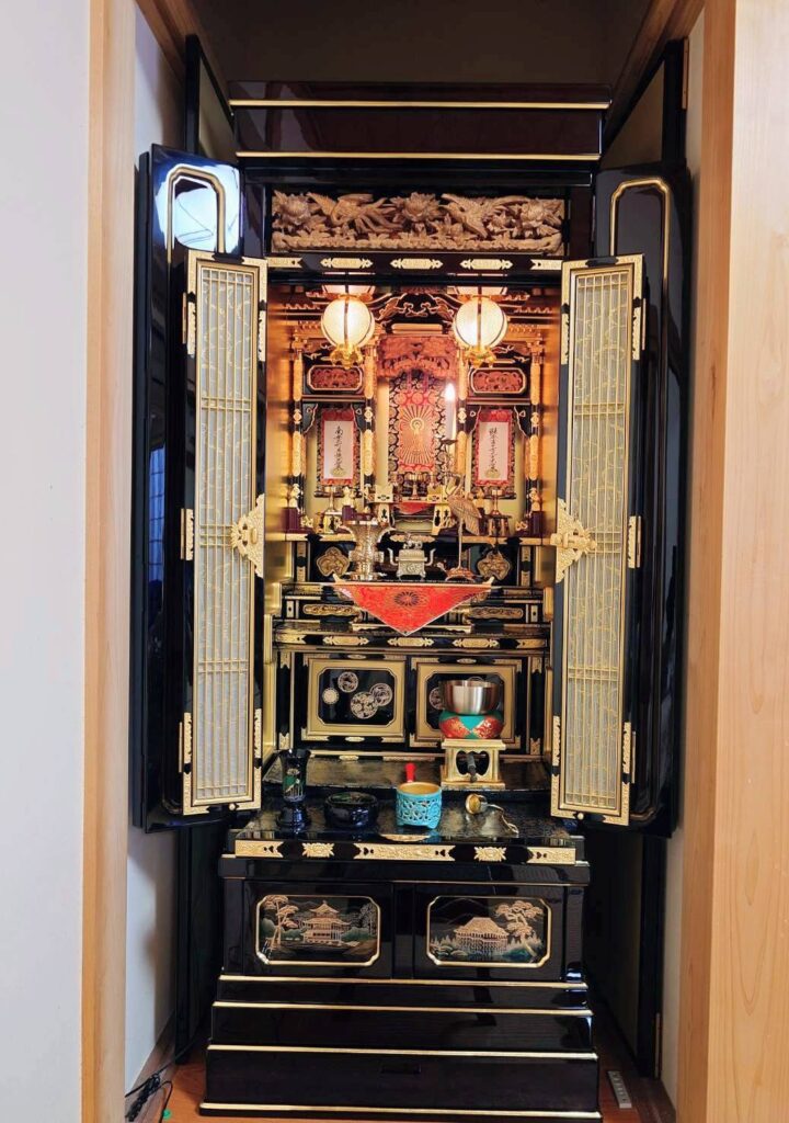 黒漆塗りで、内部に金箔が貼られています。金仏壇は主に浄土真宗で使われます。