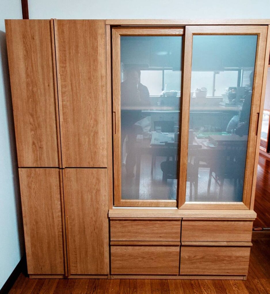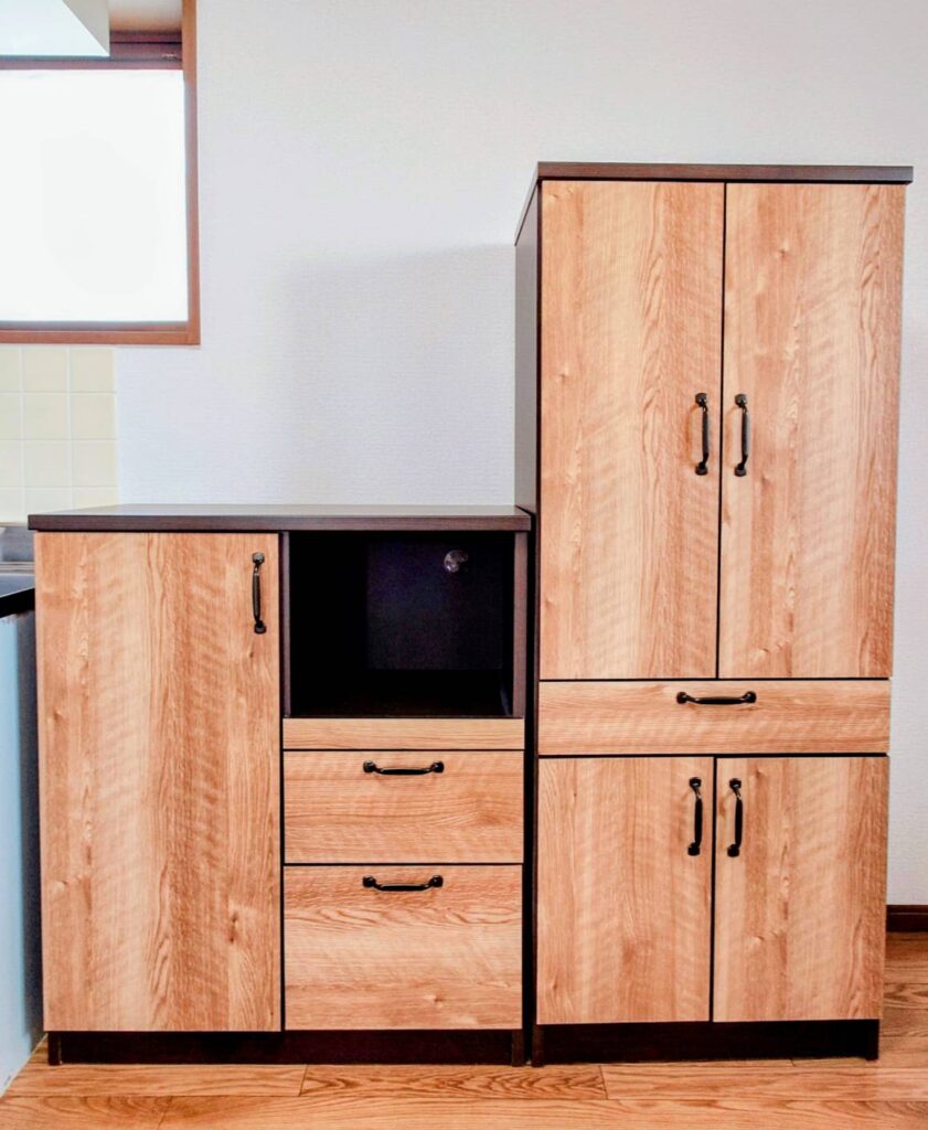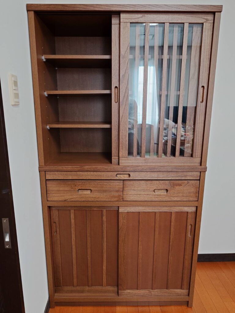 木目調がお部屋を明るく演出してくれるロータイプの国産食器棚とレンジ台を納品