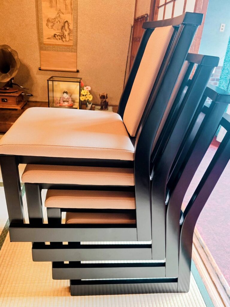 寺院様に和モダンな背付き椅子を納品させていただきました。椅子の脚部はすり足構造ですので、畳を傷つけることもなくスタッキング(積み重ね)も可能ですので、使用されない時の収納もとても便利です。