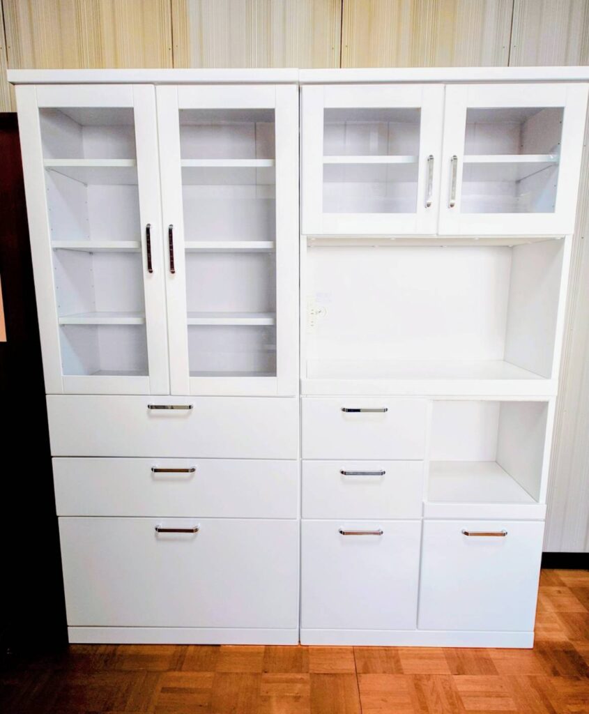 大きな扉収納、容量の大きい引出しが合計3杯で収納力抜群のダイニングボードです。