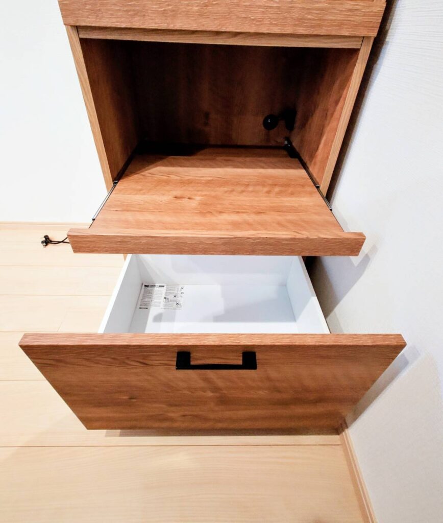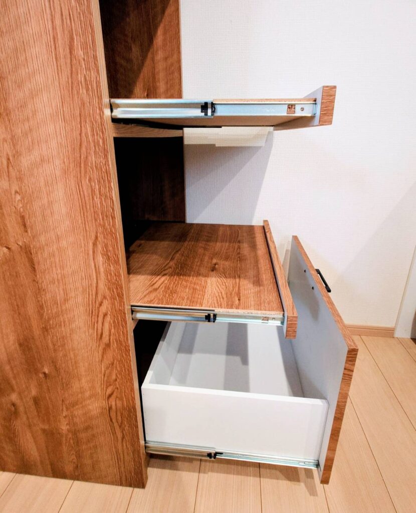 スライド棚やコンセントを備え、足元の引出しはストッパー付きのスライドレール仕様、大きめの鍋などを収納するのにとても便利で「キッチンの収納」に特化したアイテムです。