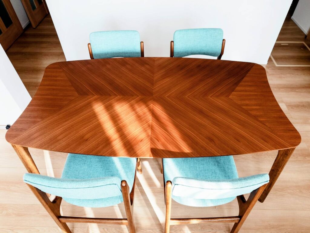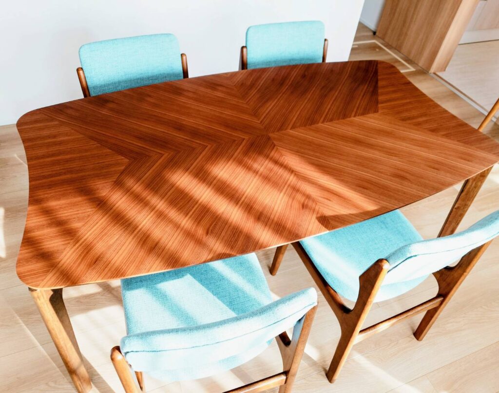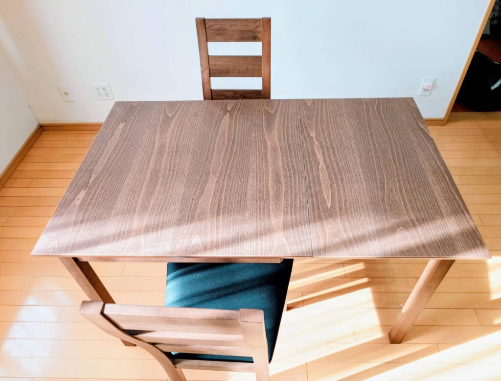 チェアが天板にかけられる天然木ダイニングセットを納品