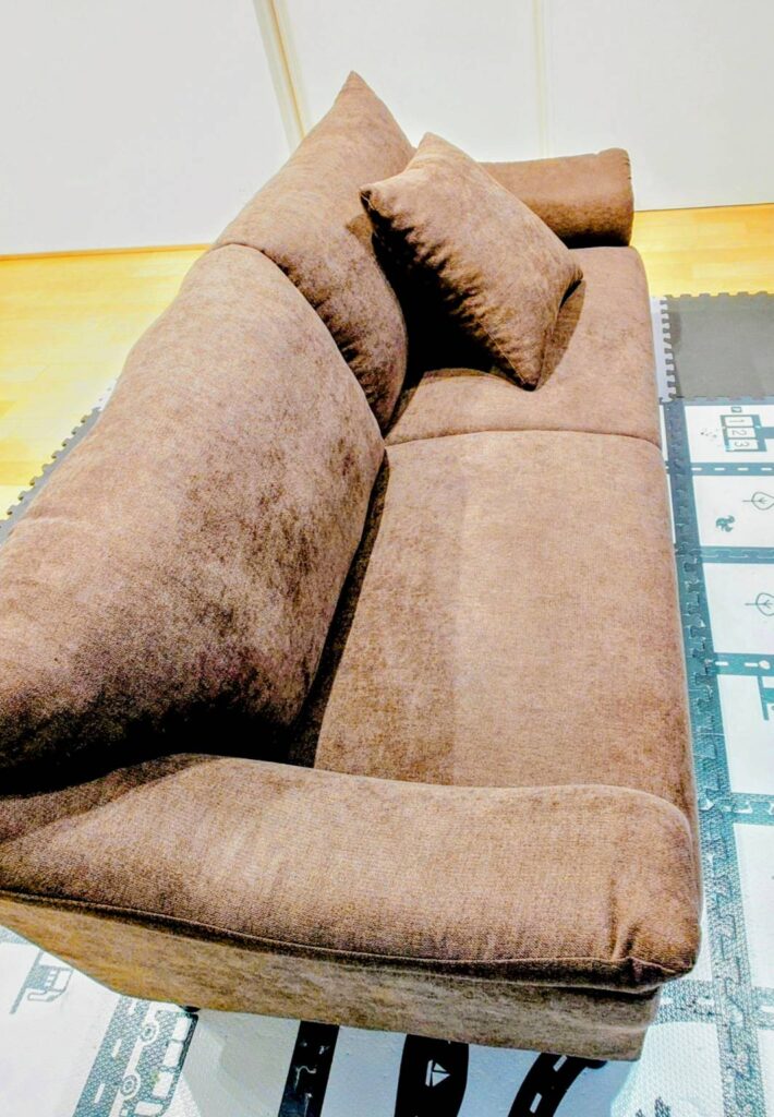 シンプルなデザインですが座面はしっかり、背もたれはふんわりとした肌触りの良い上質なファブリックを使用しており、長い時間くつろぐのに最適です。