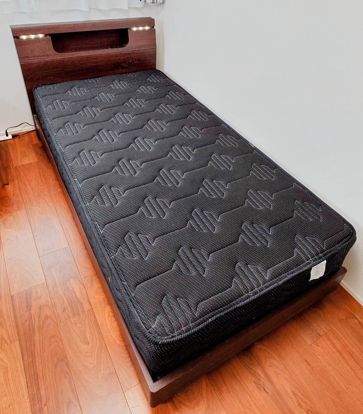 衣服や寝具などを収納できる引き出し付き、フレームは安全の縁取り加工、枕元にはLEDライト付きです。