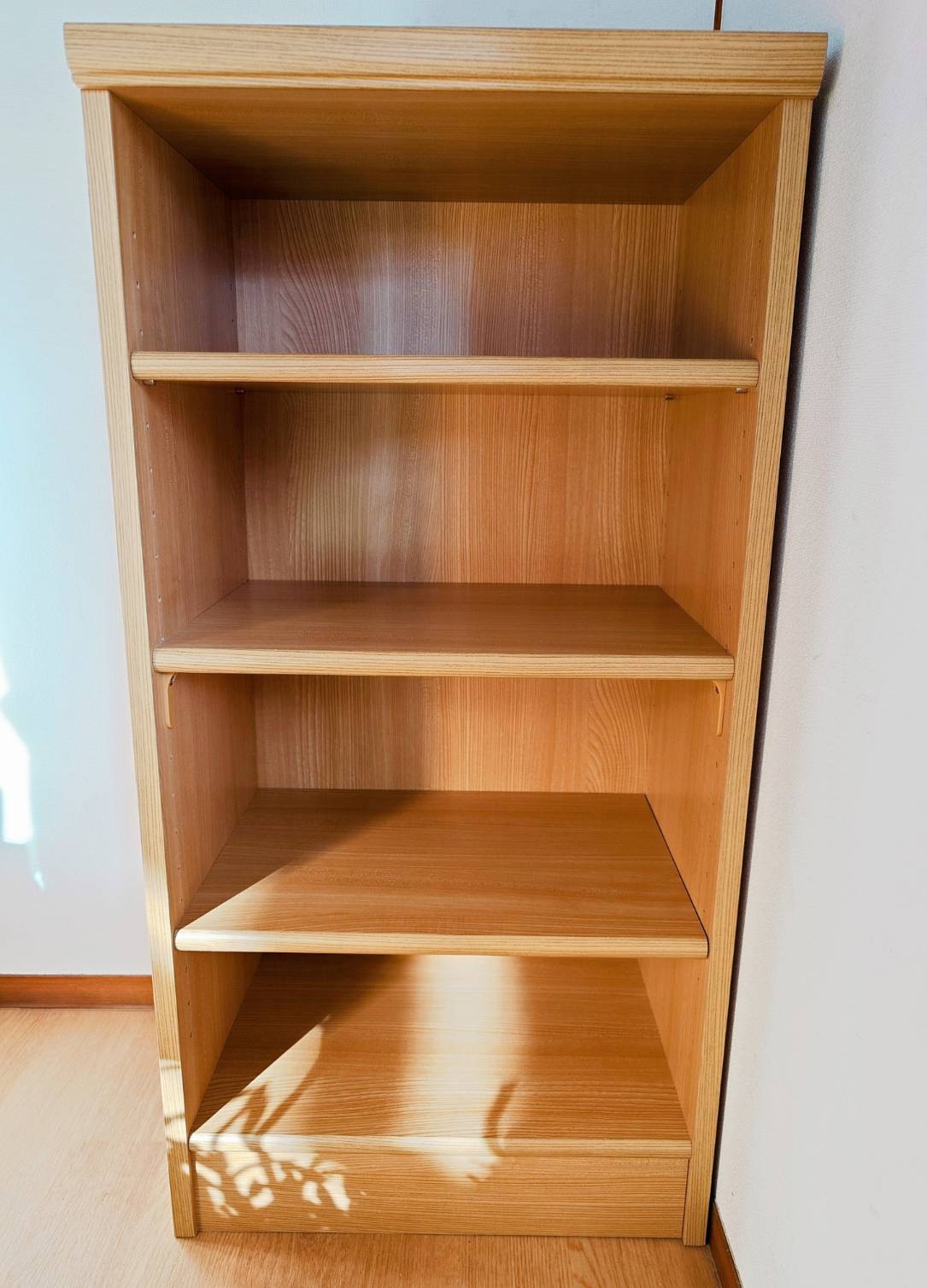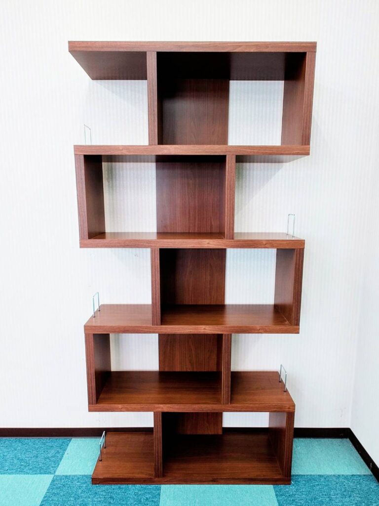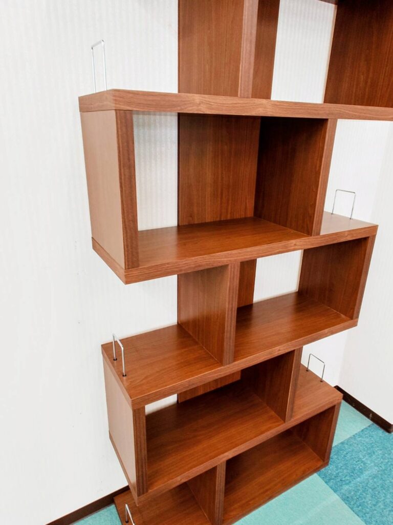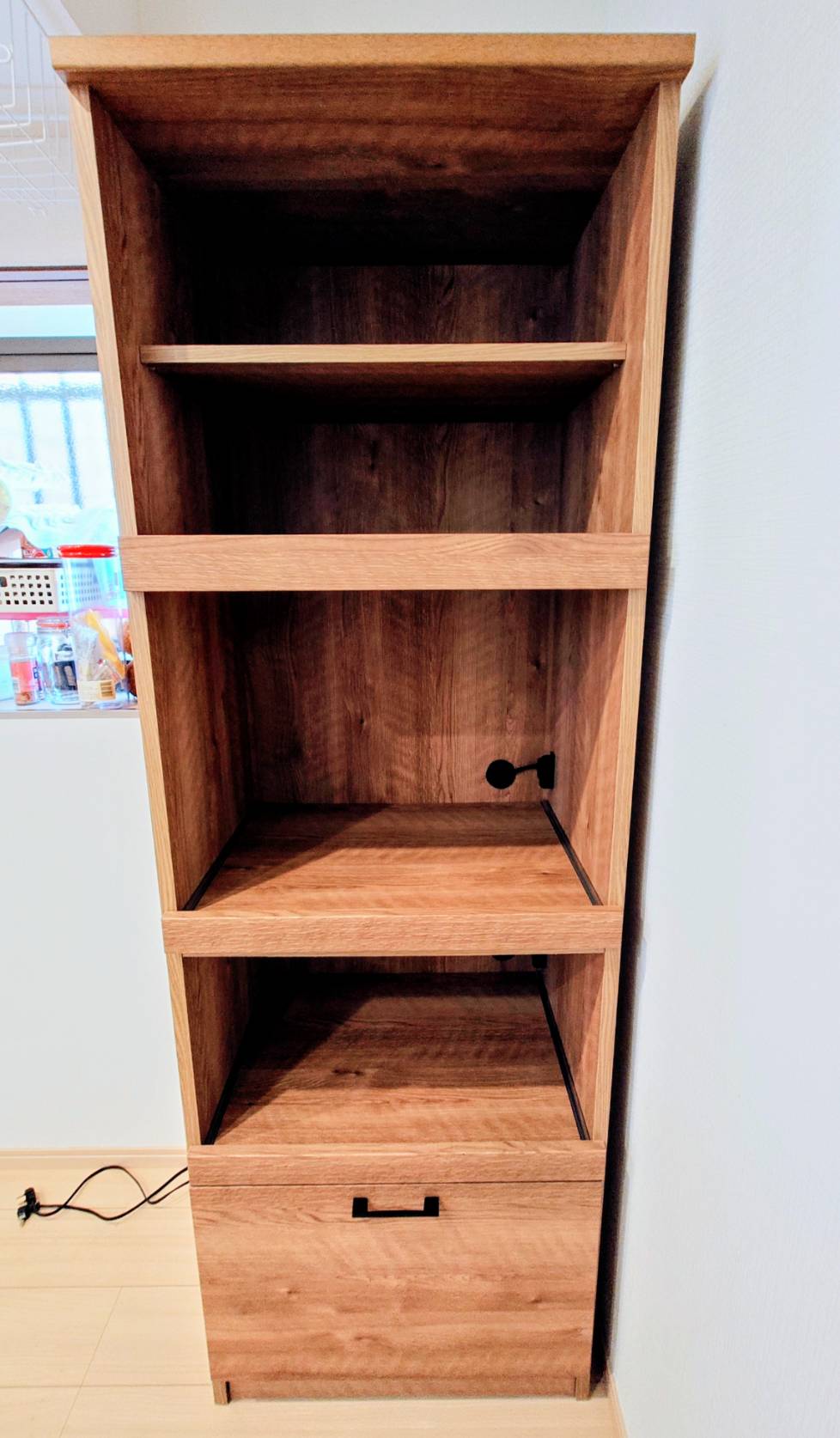 ご希望の大きさや色合い、棚板の配列、そして転倒防止の固定金具も取り付けさせていただき、全てお客様のご要望をもとに製作させていただきました。