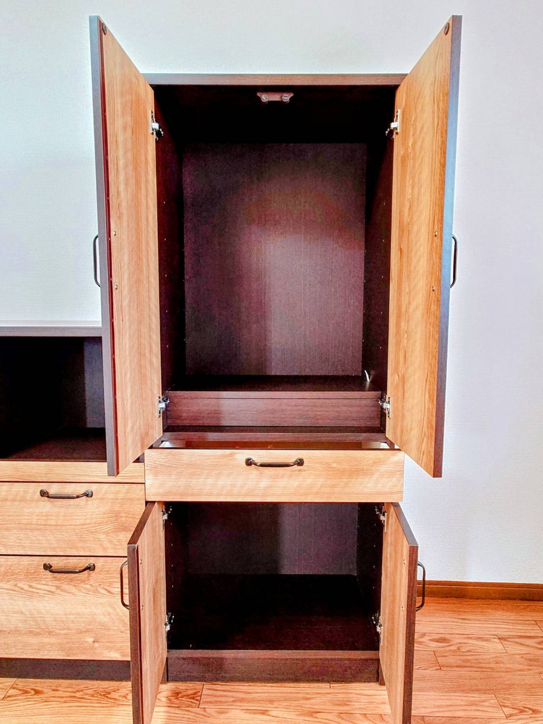 木目調がお部屋を明るく演出してくれるロータイプの国産食器棚とレンジ台を納品