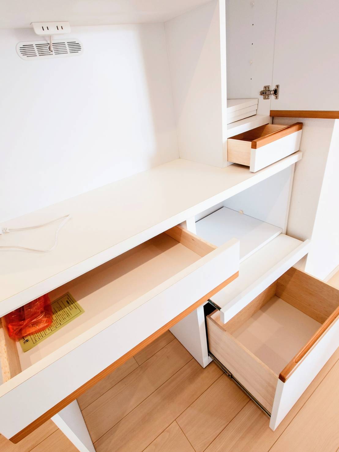 オープンスペース、スライドカウンター、引出し収納、開き戸収納と豊富な収納スペースには、食器やキッチン家電はもちろん、食品やキッチンまわりの小物まで全てが収まる収納力抜群の商品です。
