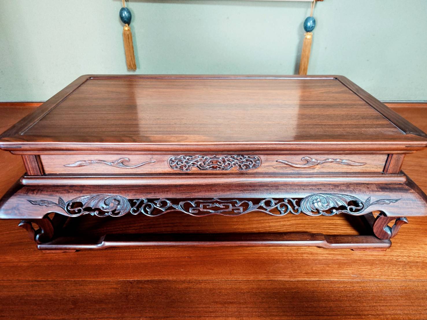 こちらの花台は最高級の本紫檀を使い、天板は一枚板の貴重な品となります。