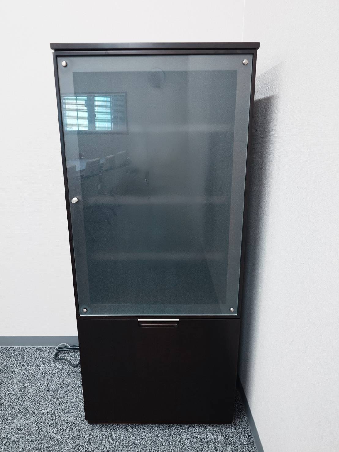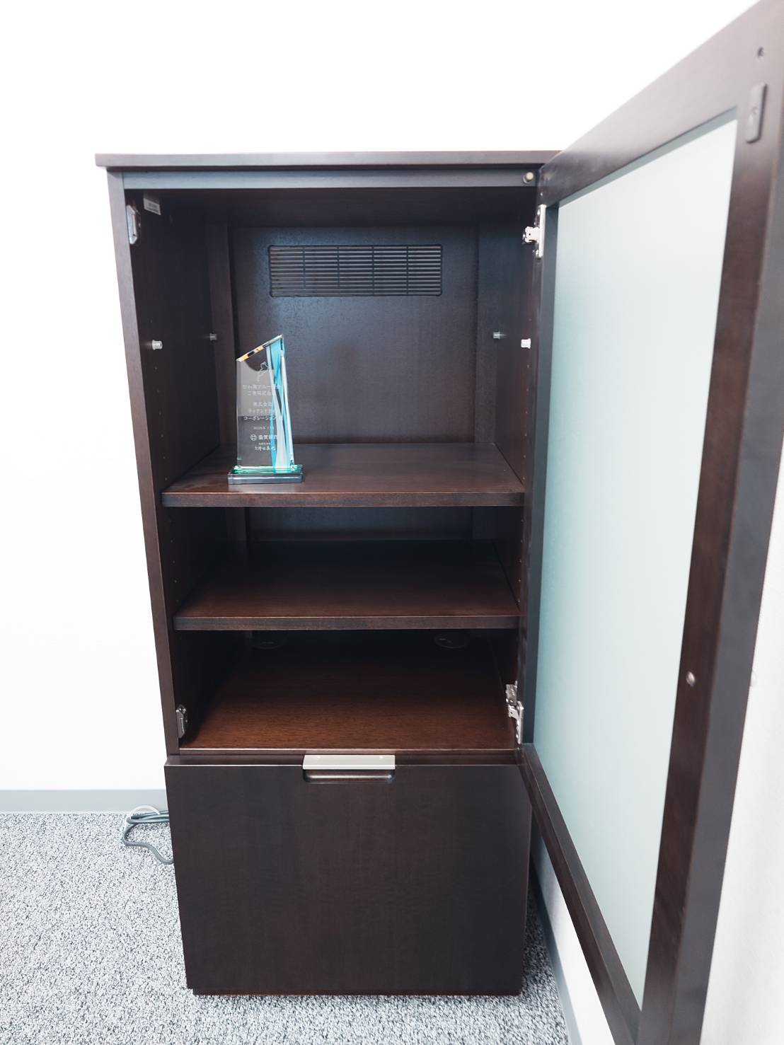 AV機器を設置できるように内部にコンセプトタップが付いてあり、稼働棚も3枚、引き出しもサテンシカモアの突き板仕上げですので柔らかくも重厚な存在感。オフィスやリビング空間で、飾る、魅せる収納にこだわった商品です。